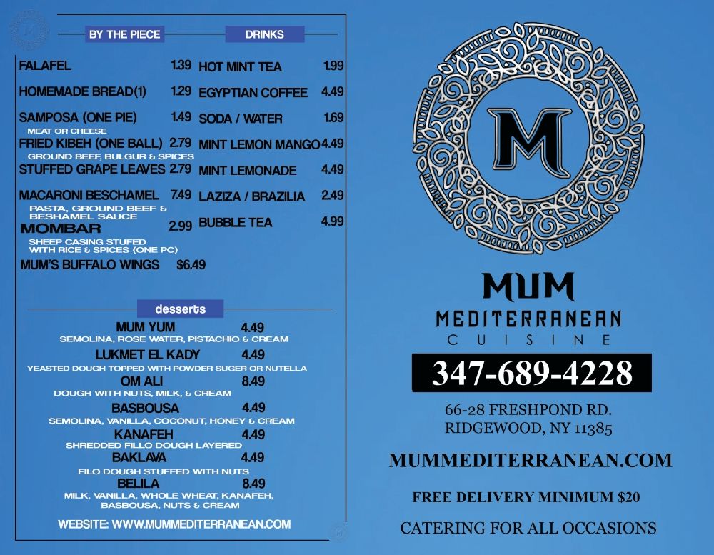 MUM Mediterranean Cuisine offers a wide range of Mediterranean dishes with a focus on kebabs. Located in Queens, NY, this restaurant provides delivery, takeout, catering, and outdoor seating. The menu includes hot appetizers like falafel and chicken nuggets, soups like lentil soup, and cold appetizers such as hummus and tabbouleh. Customers rave about the flavorful and fresh food, with highlights like the mom falafel platter and chicken kebab on pita. The friendly service and clean environment add to the dining experience. Reviewers praise the authentic Egyptian flavors, like koshari and mombar, making this restaurant a hidden gem for those craving traditional cuisine. With a variety of options to choose from, MUM Mediterranean Cuisine is a must-try for anyone looking for delicious Mediterranean meals in a welcoming setting.